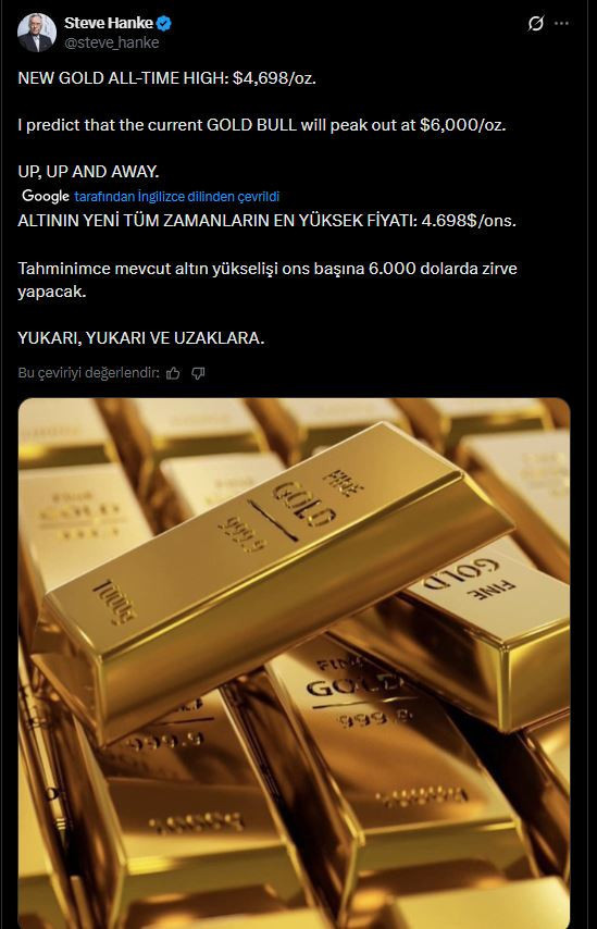 Ekonomist Profesör Steve Hanke, altının tüm vakitlerin en yüksek fiyatı 4698 dolara yükseldiğini hatırlatarak, altının göreceği seviyeyi toplumsal medya hesabından paylaştı.