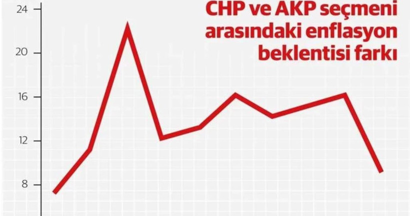 Demiralp, enflasyonun yalnızca fiyat artışlarını değil, tıpkı vakitte siyasi tansiyonu, kurumsal inancı ve idareye duyulan inancı yansıttığını belirtti. Araştırma bulgularına dayanan tahlilinde, 2025 yılı için CHP ve AKP seçmenlerinin enflasyon beklentileri ortasındaki farkı gösteren bir grafik paylaştı.